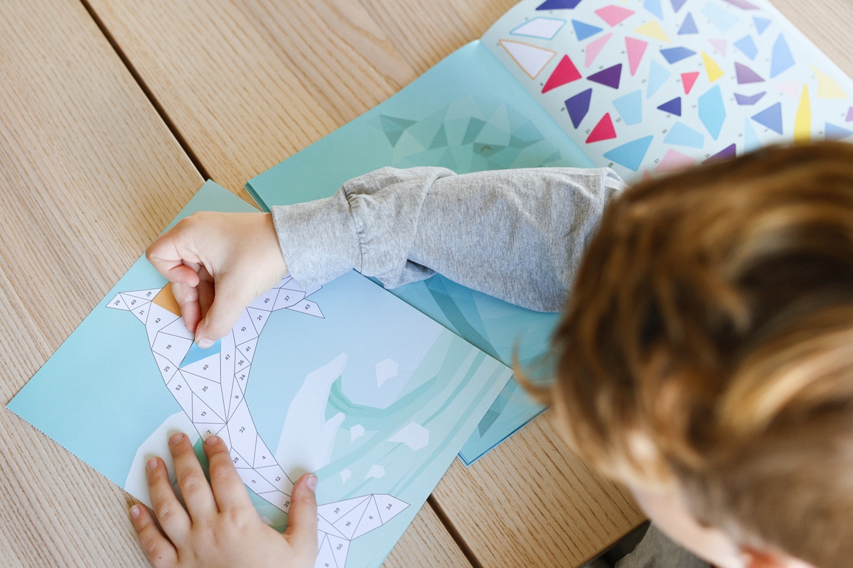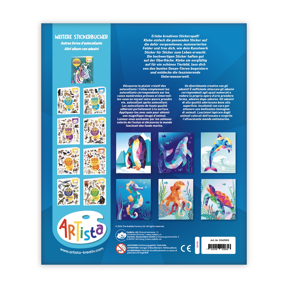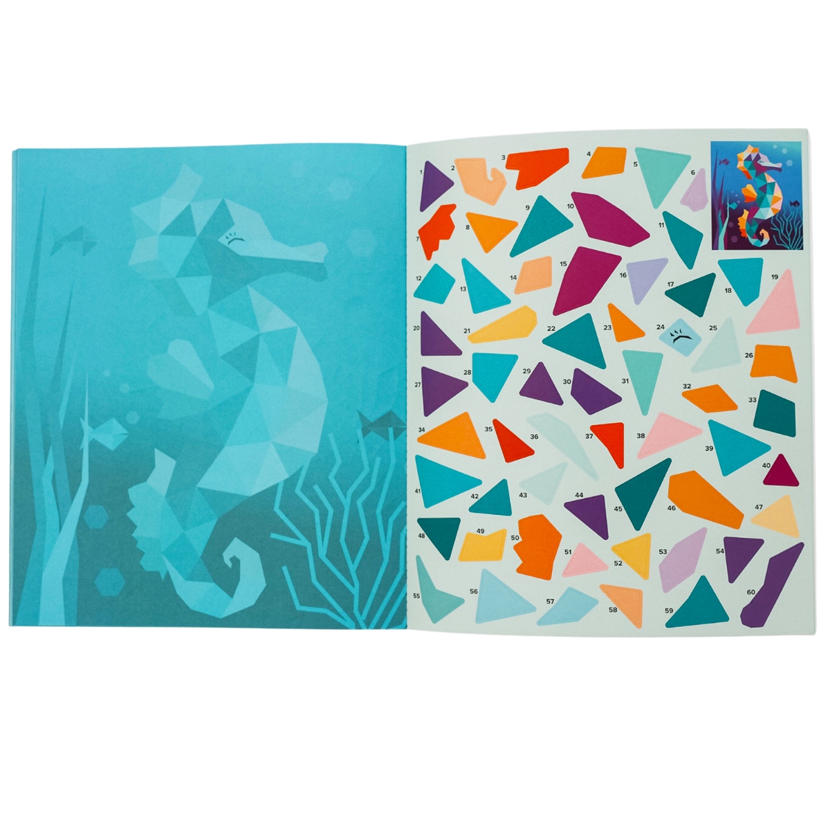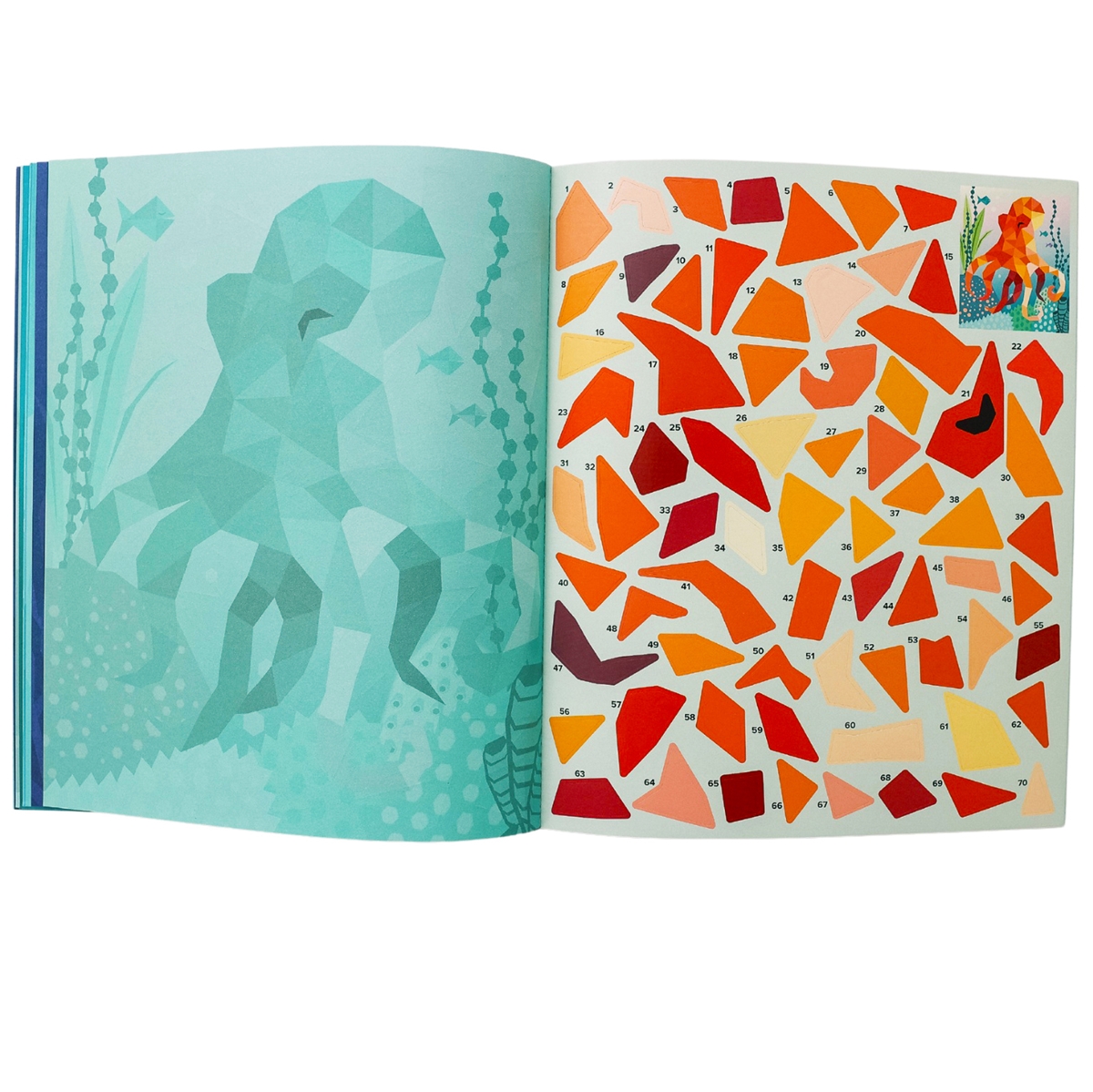 Einfach die passenden Sticker auf die dafür vorgesehenen, nummerierten Felder kleben und schon entstehen Sticker für Sticker schöne Kunstwerke zum Thema Ozean.