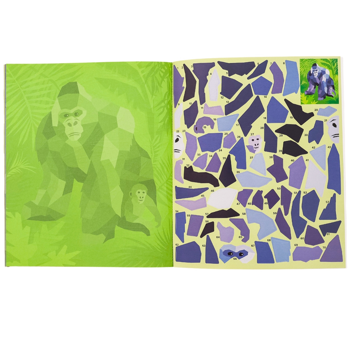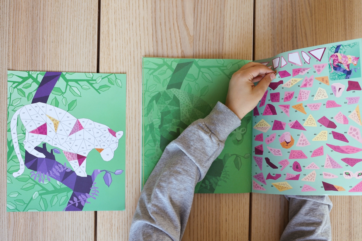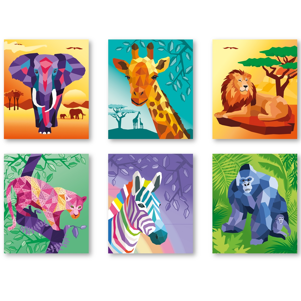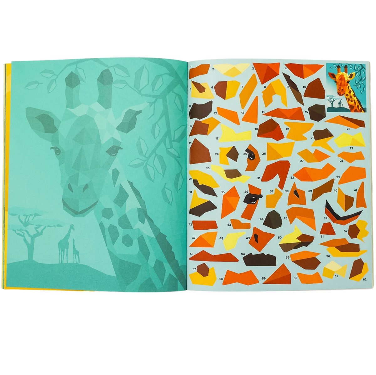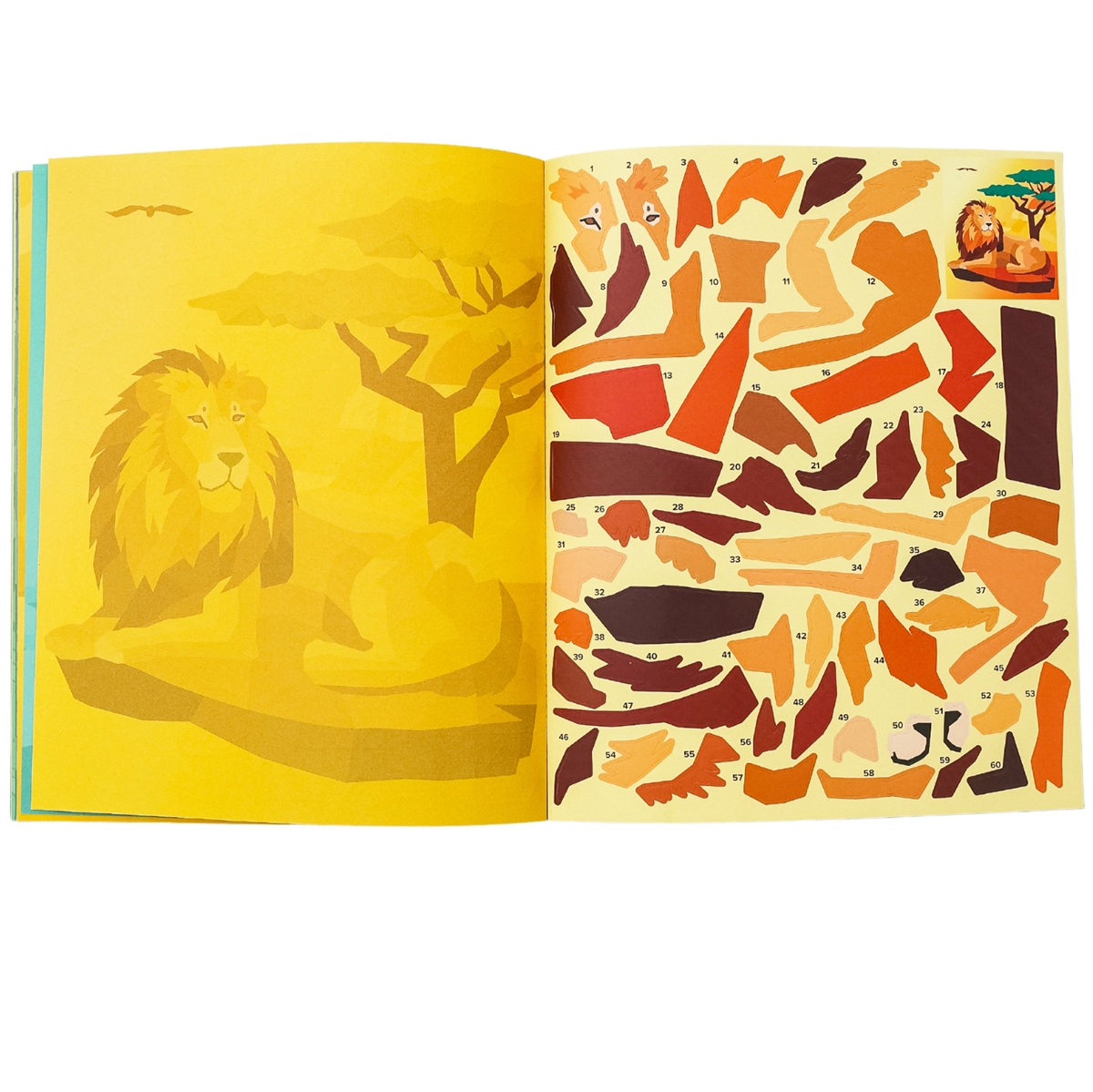 Einfach die passenden Sticker auf die dafür vorgesehenen, nummerierten Felder kleben und schon entstehen Sticker für Sticker schöne Kunstwerke zum Thema Safari.